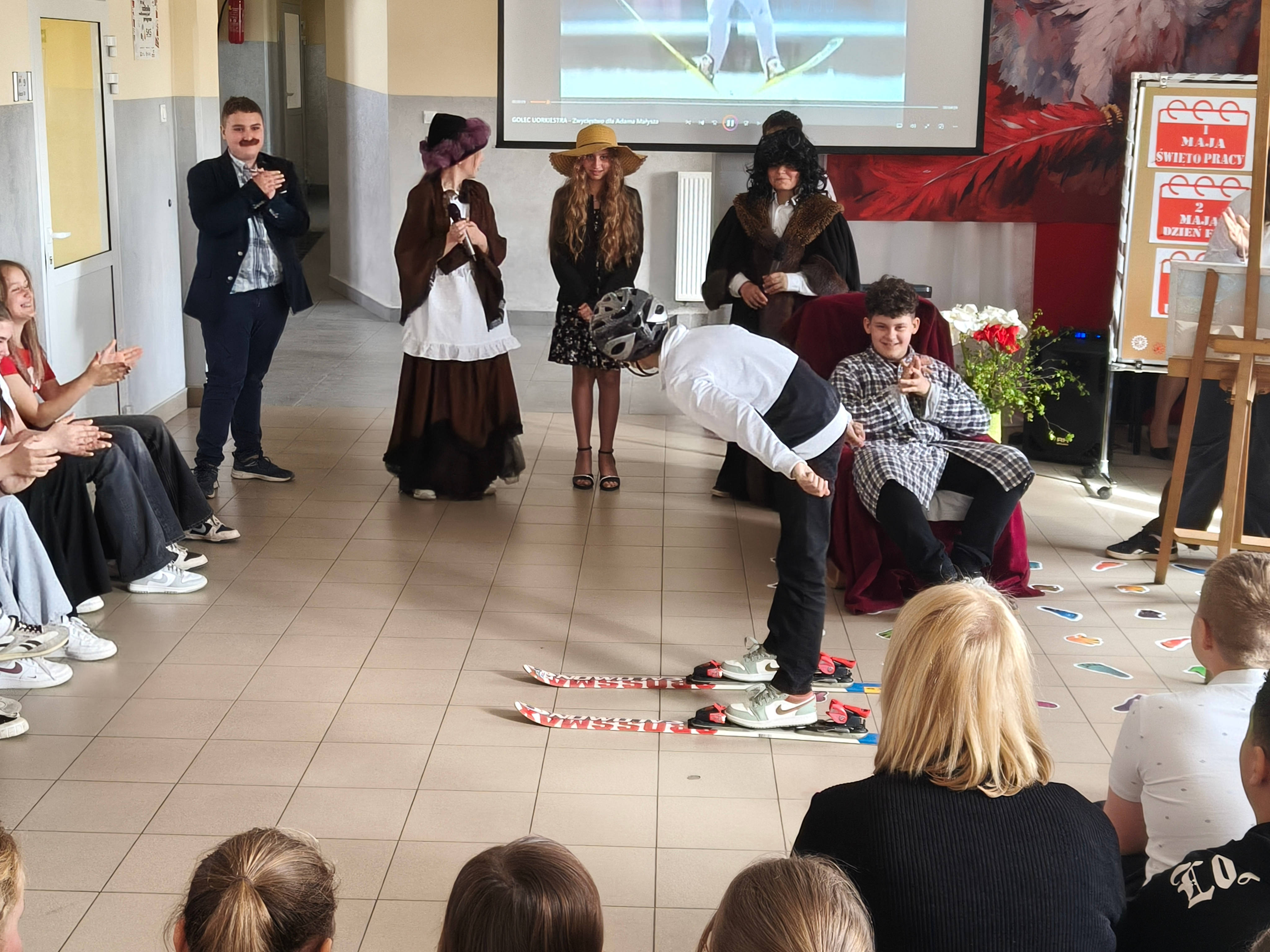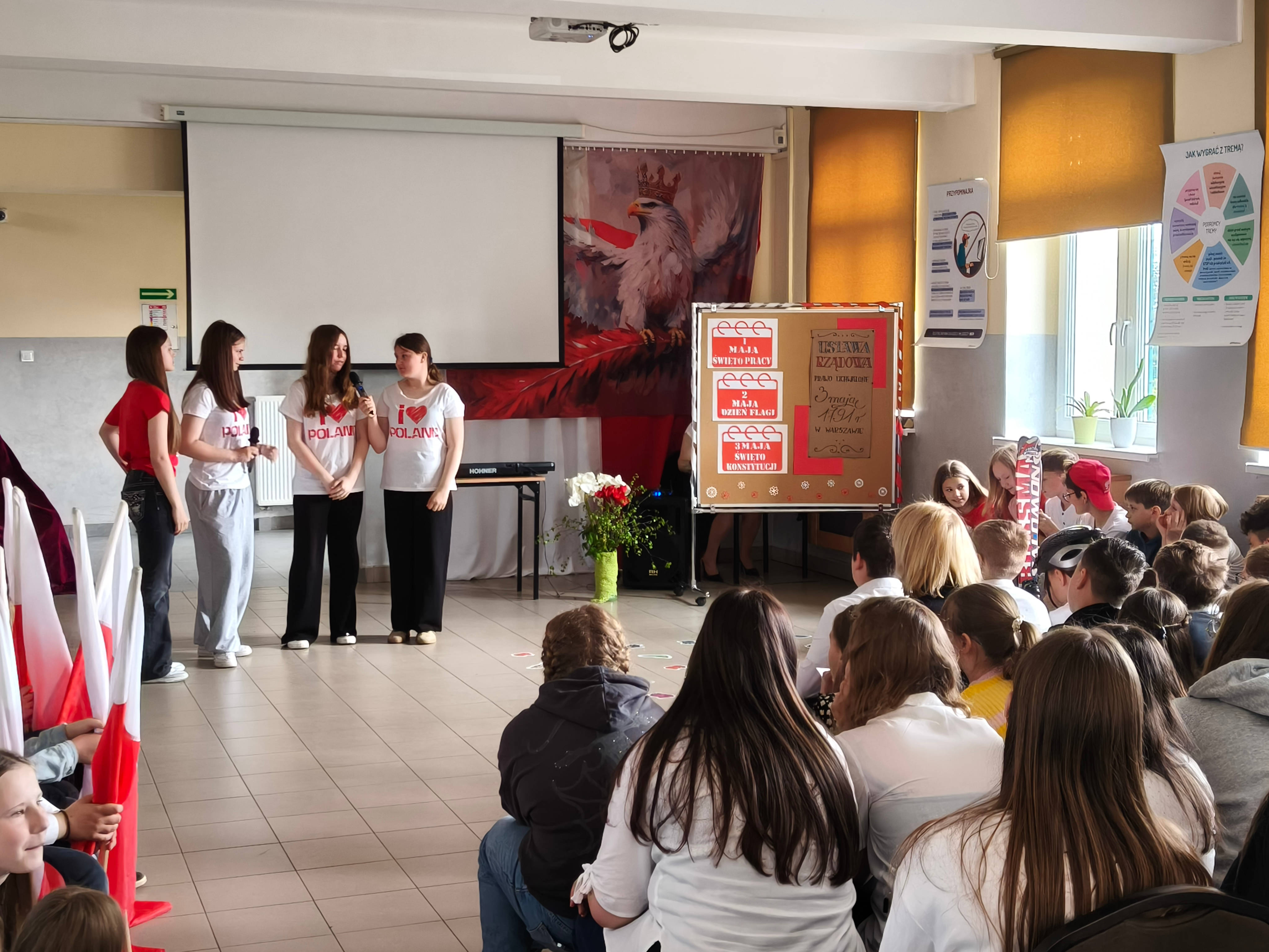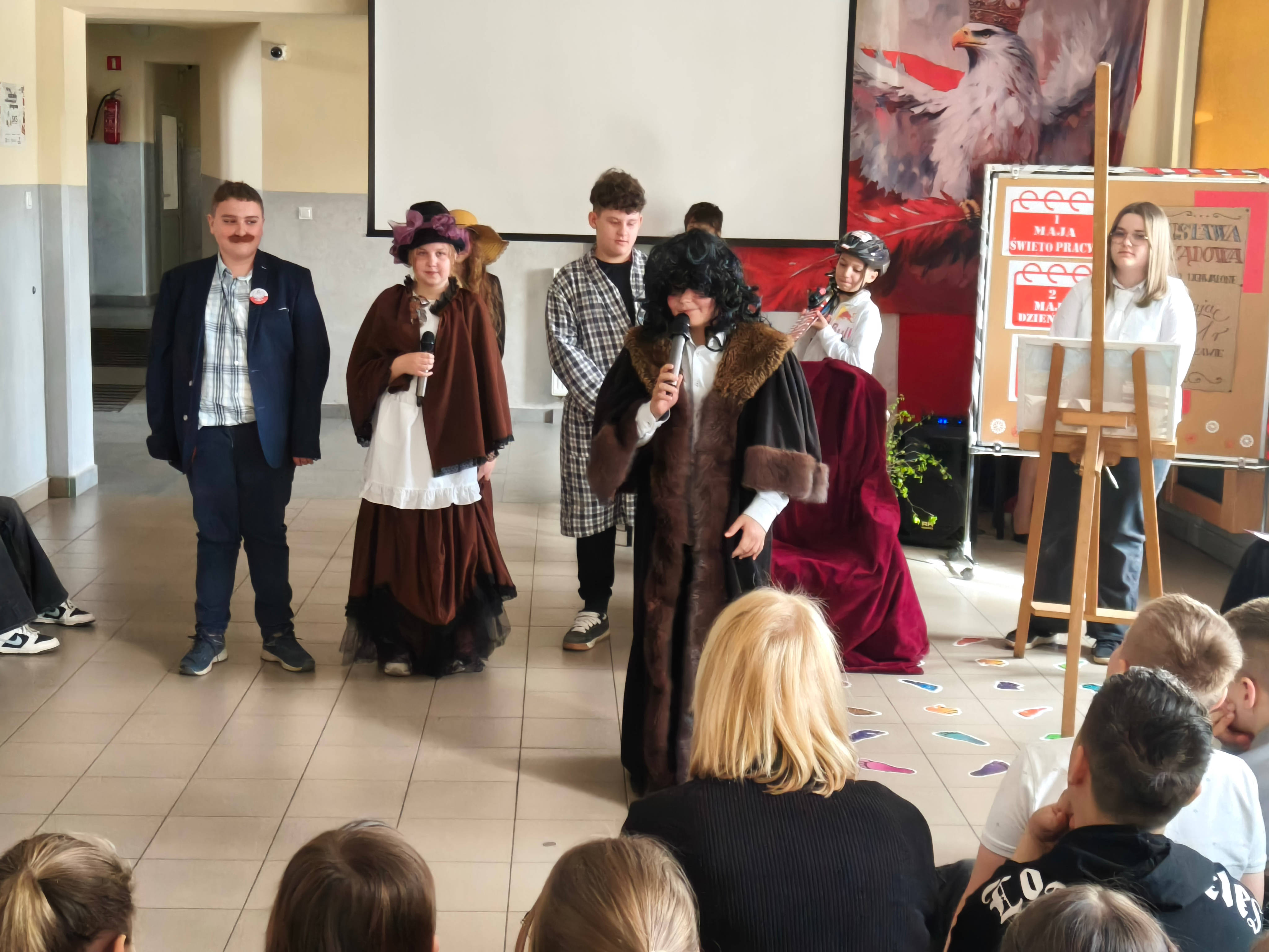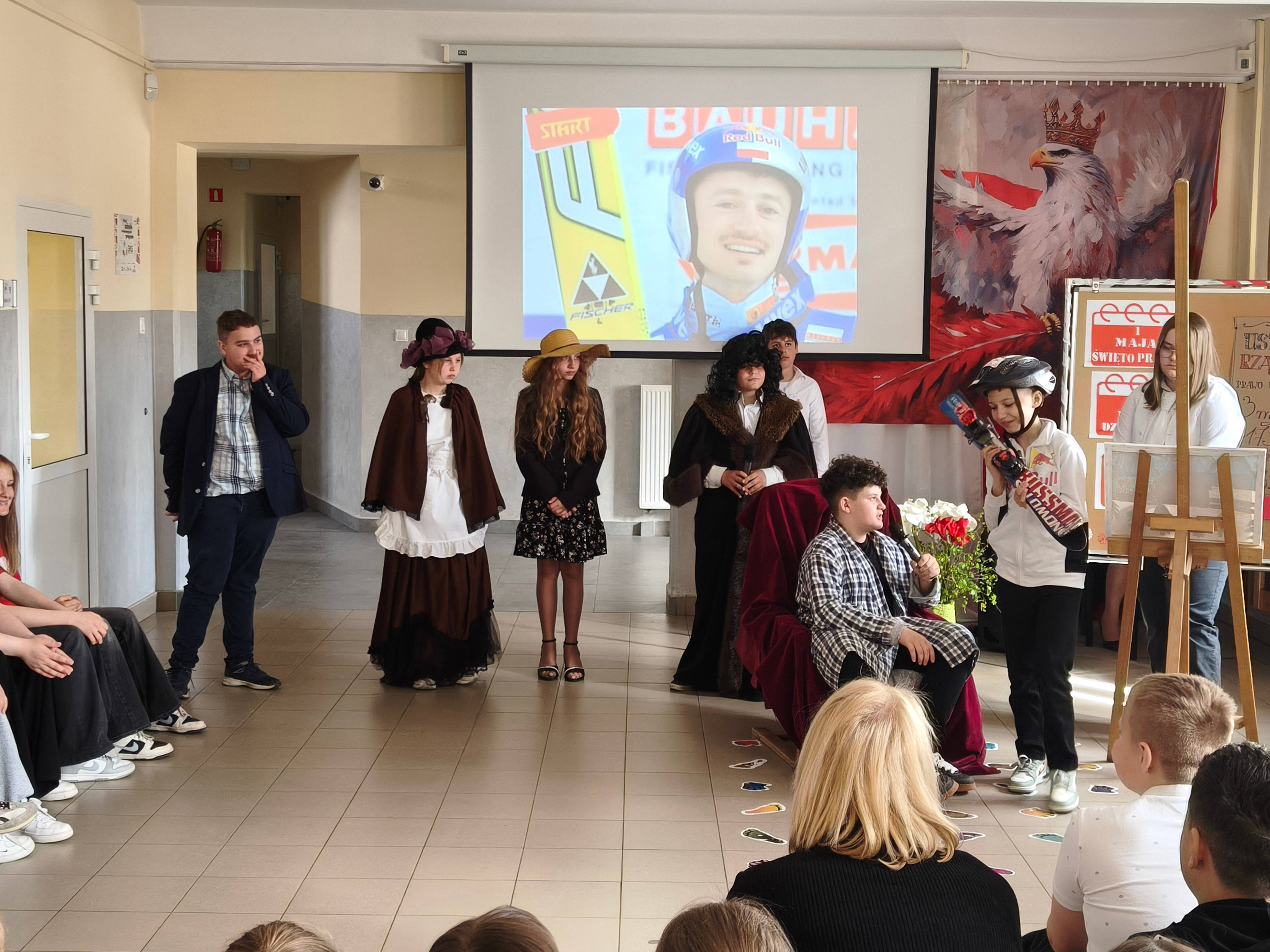27 kwietnia w naszej szkole odbył się uroczysty apel z okazji Świąt Majowych – Dnia Flagi Rzeczypospolitej Polskiej oraz Święta Uchwalenia Konstytucji 3 Maja. Uczniowie klas IV i V przygotowali część artystyczną, podczas której zaprezentowali scenki upamiętniające ważne wydarzenia z historii Polski. Szczególnym elementem uroczystości był barwny korowód postaci historycznych i wybitnych Polaków. Uczniowie wcielili się m.in. w Jana Matejkę, Fryderyka Chopina, Jana III Sobieskiego, Adama Małysza, Wisławę Szymborską, Marię Skłodowską-Curie oraz Lecha Wałęsę, prezentując dorobek i znaczenie tych postaci dla historii i kultury naszego kraju. Uroczystość uświetniły występy artystyczne – taniec z flagami oraz pieśni o tematyce patriotycznej, które podkreśliły podniosły charakter wydarzenia. Apel był ważną lekcją historii i patriotyzmu dla całej społeczności szkolnej. /LKS, ER/