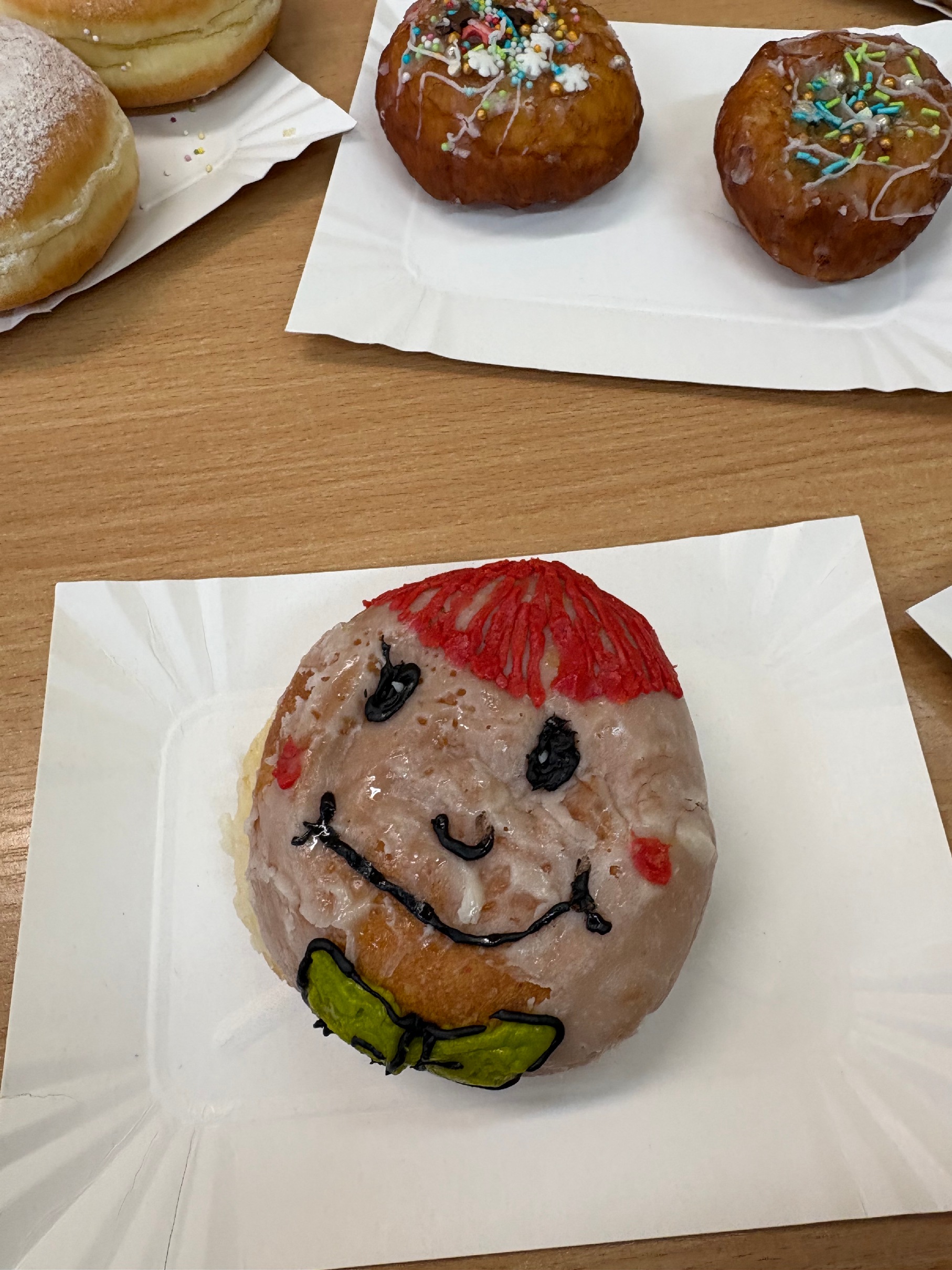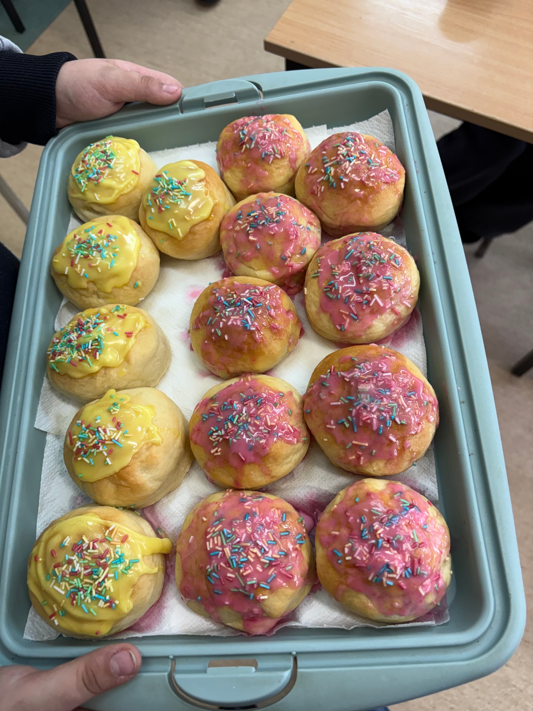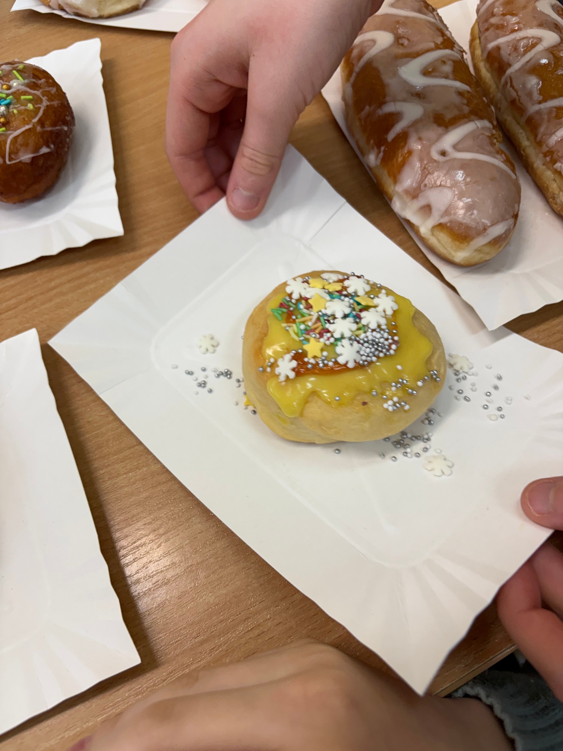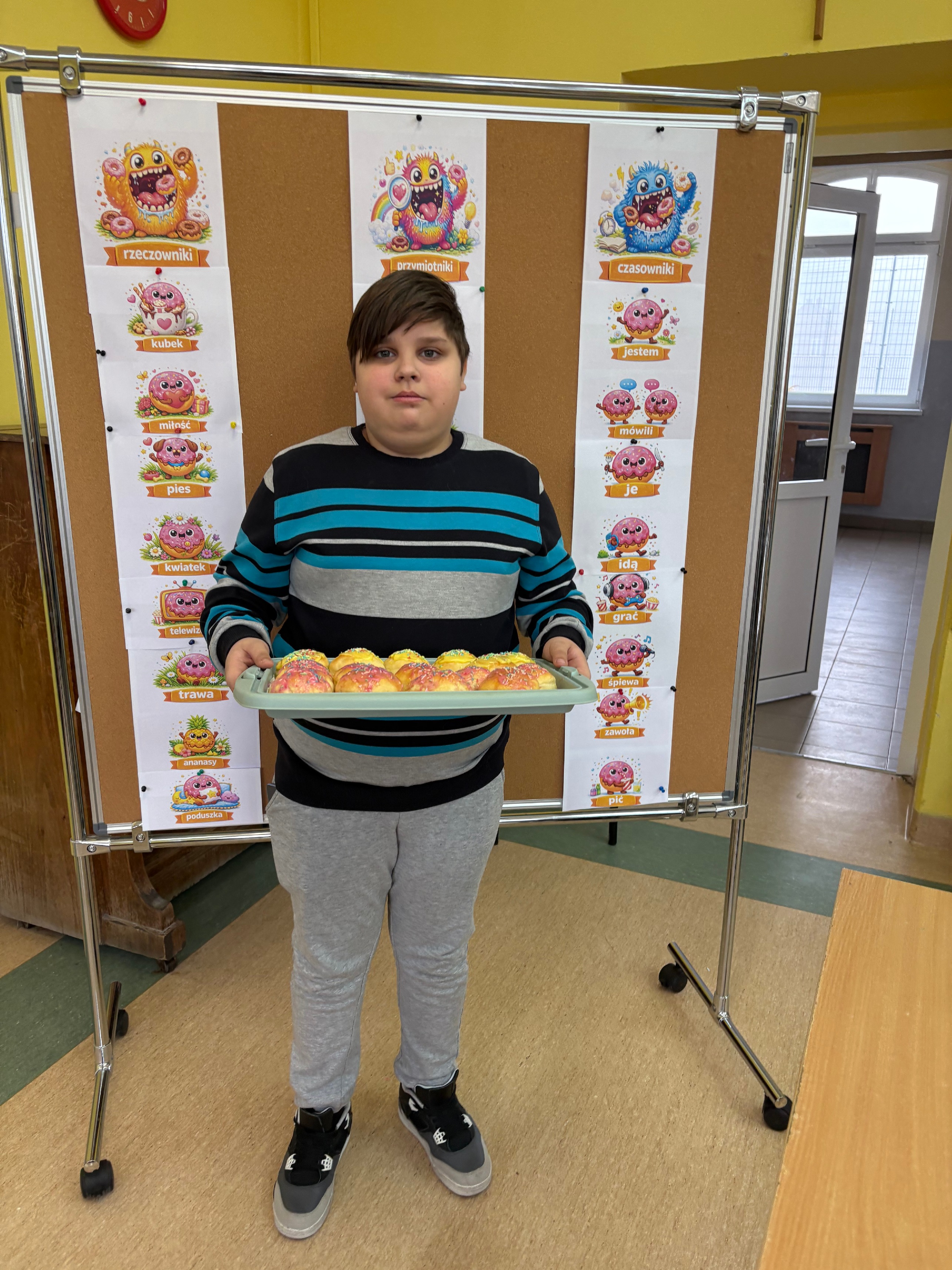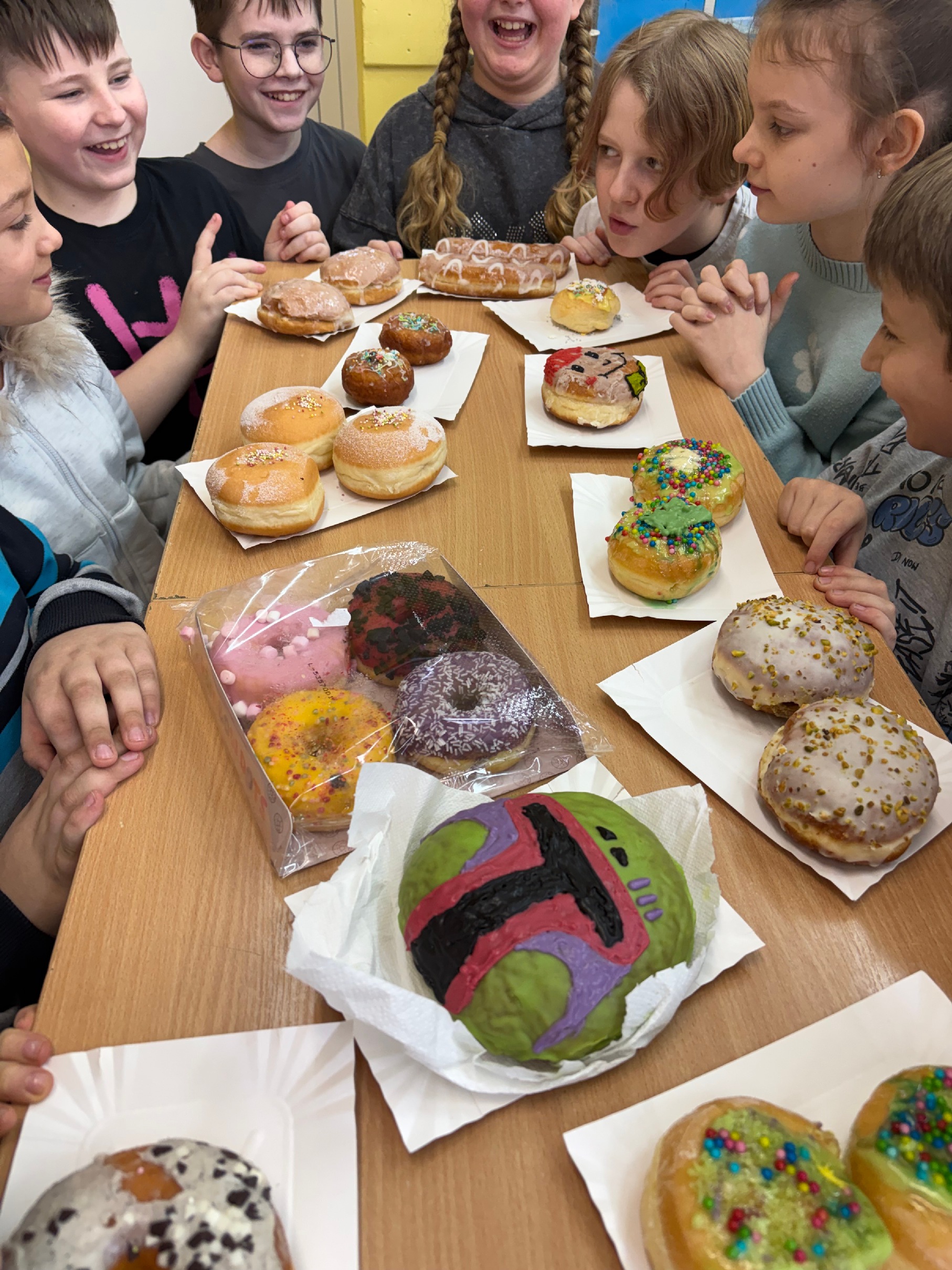 Kolejnym zadaniem było dekorowanie pączków z wykorzystaniem jak największej liczby przymiotników i rzeczowników. Powstały barwne, apetyczne opisy oraz oryginalne projekty słodkości, które uczniowie z dumą prezentowali na forum klasy.