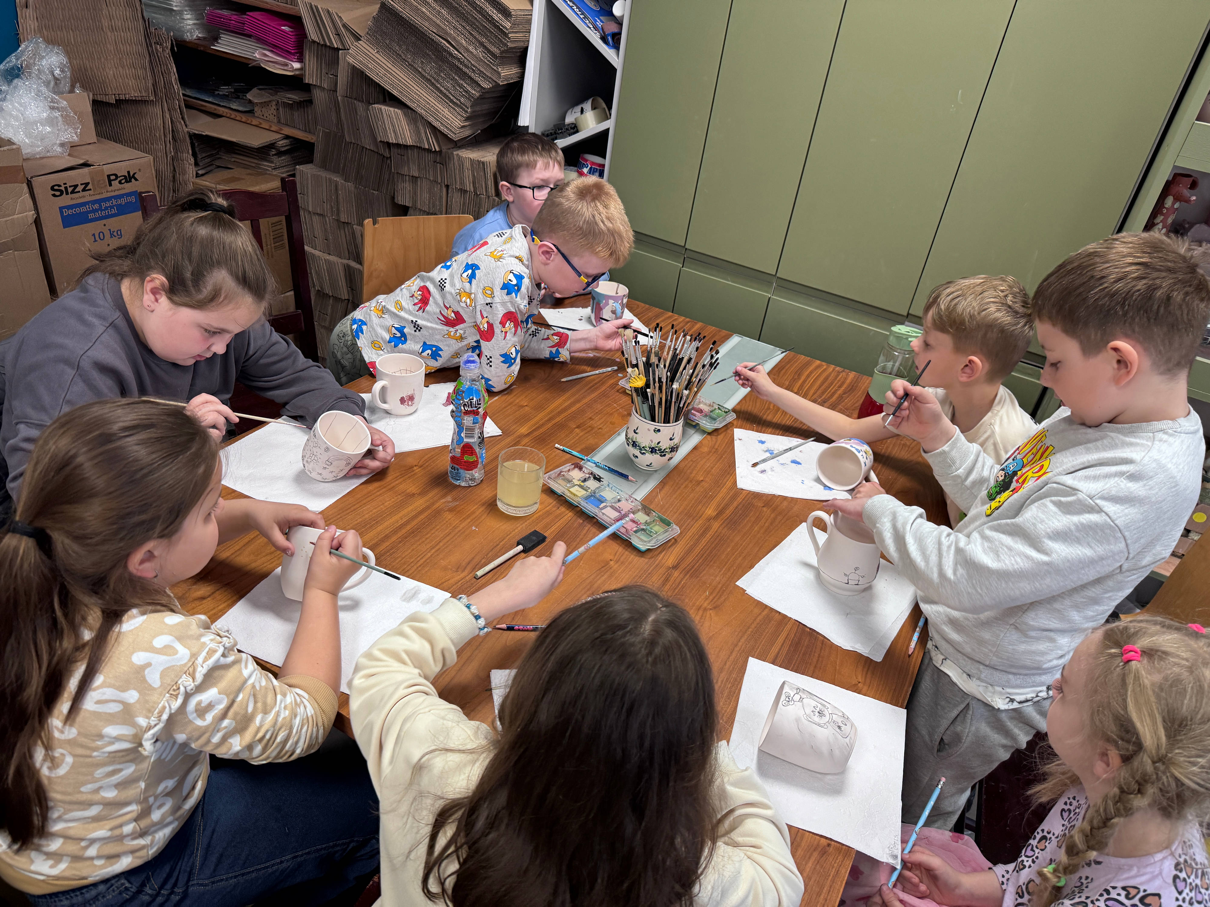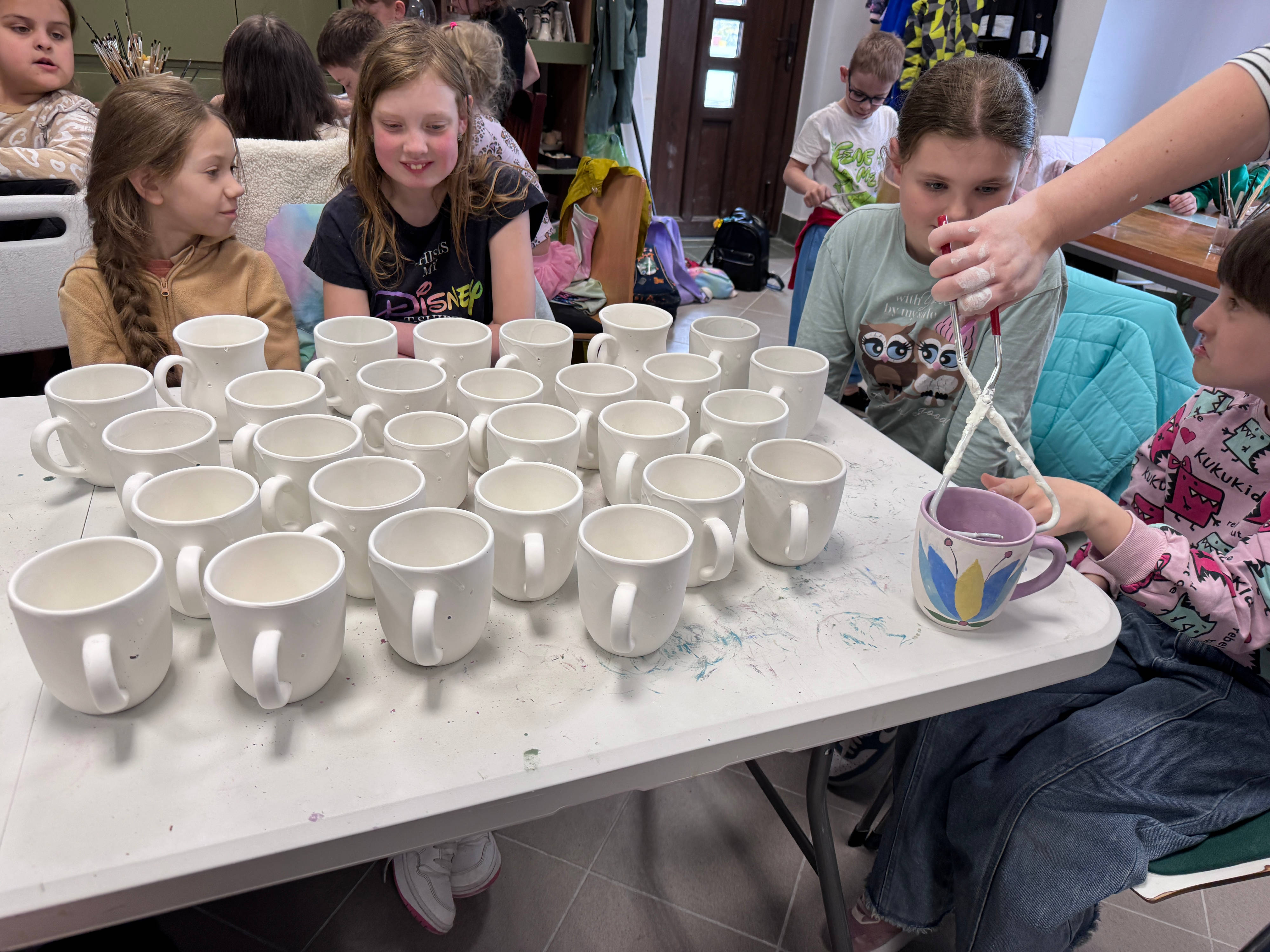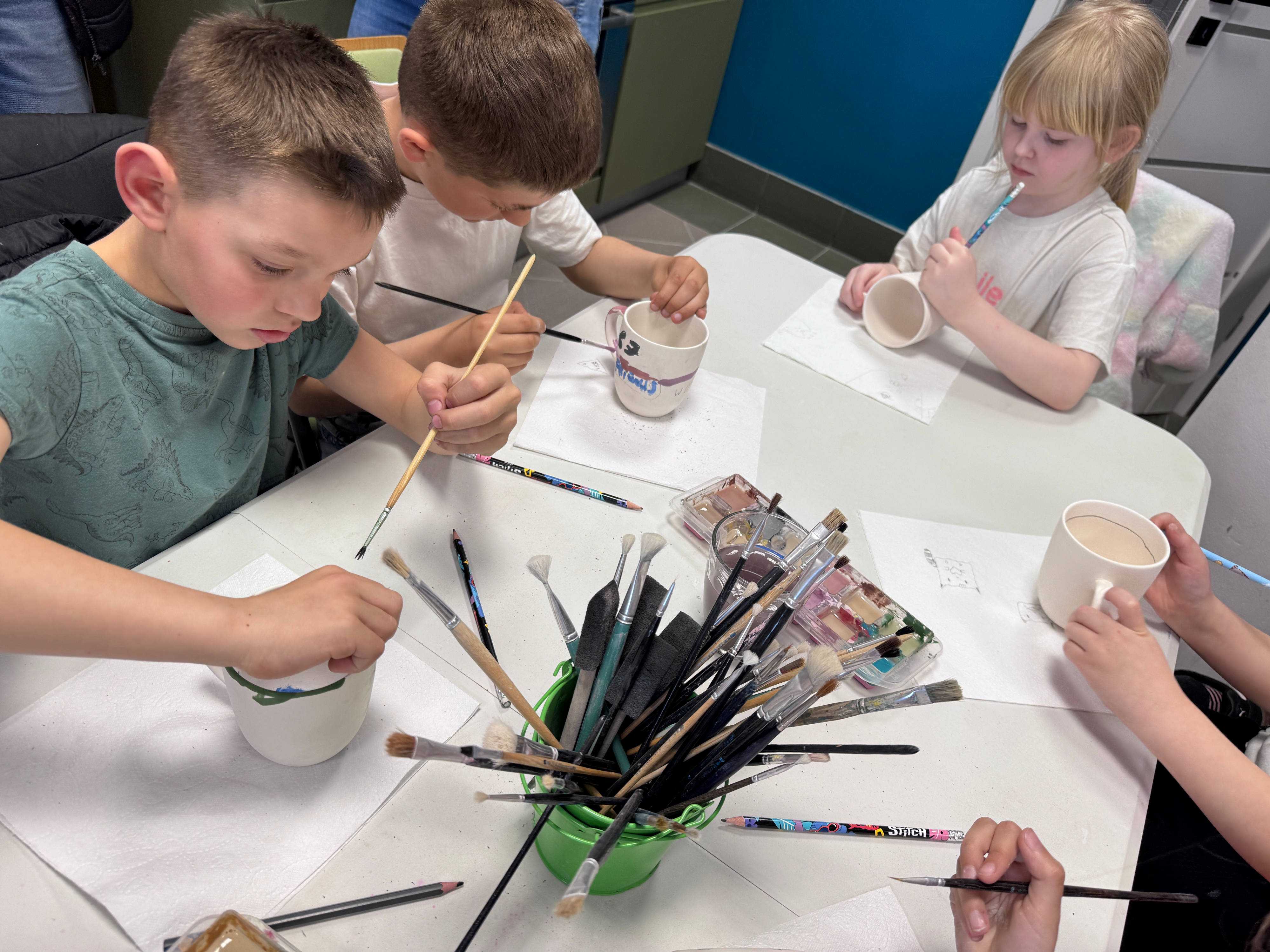 Uczniowie klas I–III uczący się języka kaszubskiego wzięli udział w wyjątkowych warsztatach ceramicznych, które odbyły się w Pracowni Ceramicznej Arbata. Podczas zajęć dzieci miały okazję nie tylko poznać podstawy pracy z ceramiką, ale również rozwijać swoją kreatywność i wrażliwość artystyczną. Głównym zadaniem uczestników było własnoręczne ozdabianie kubków z wykorzystaniem tradycyjnych motywów kaszubskich. Każdy kubek był niepowtarzalny i stanowił wyjątkową pamiątkę z warsztatów.