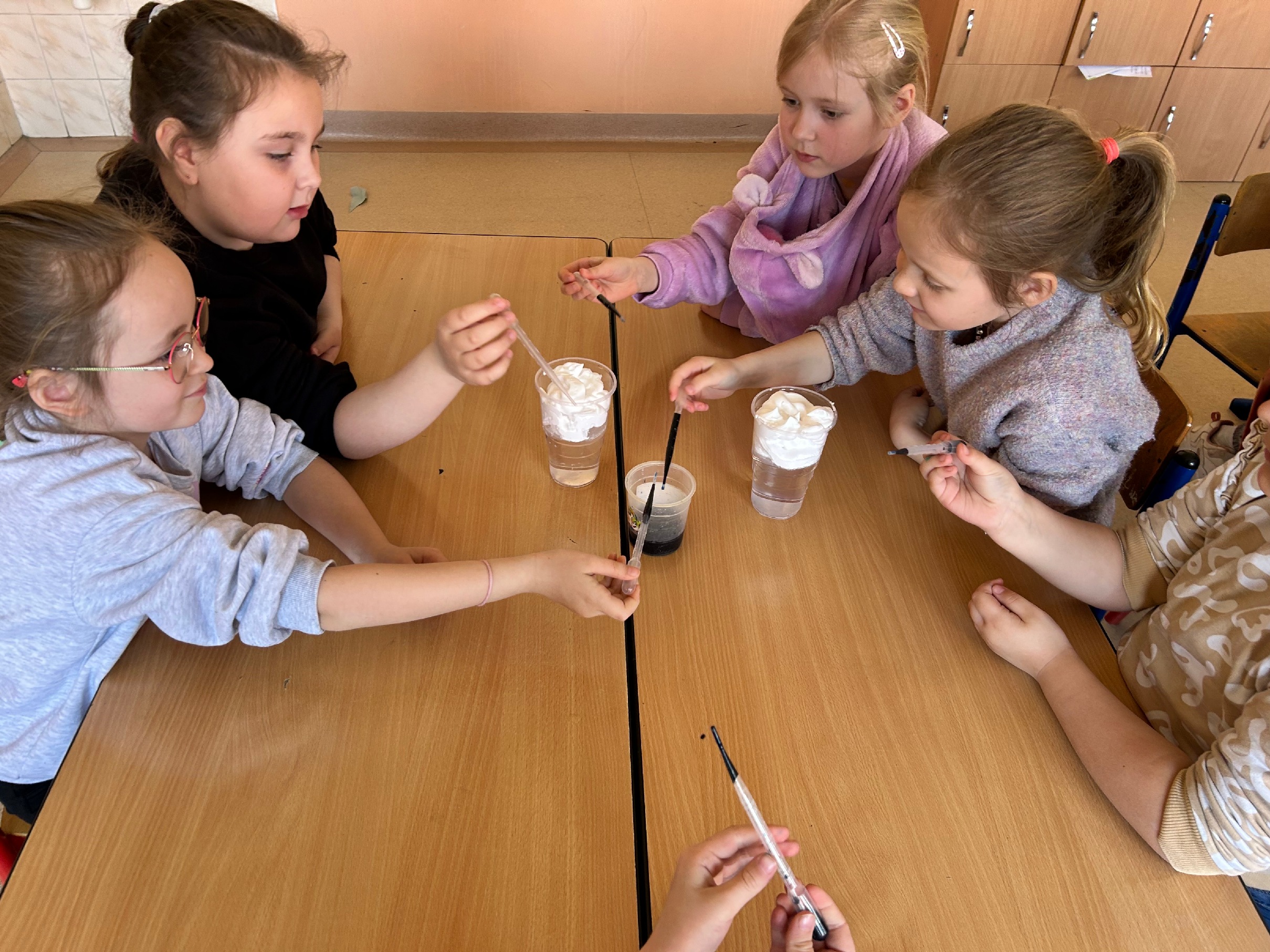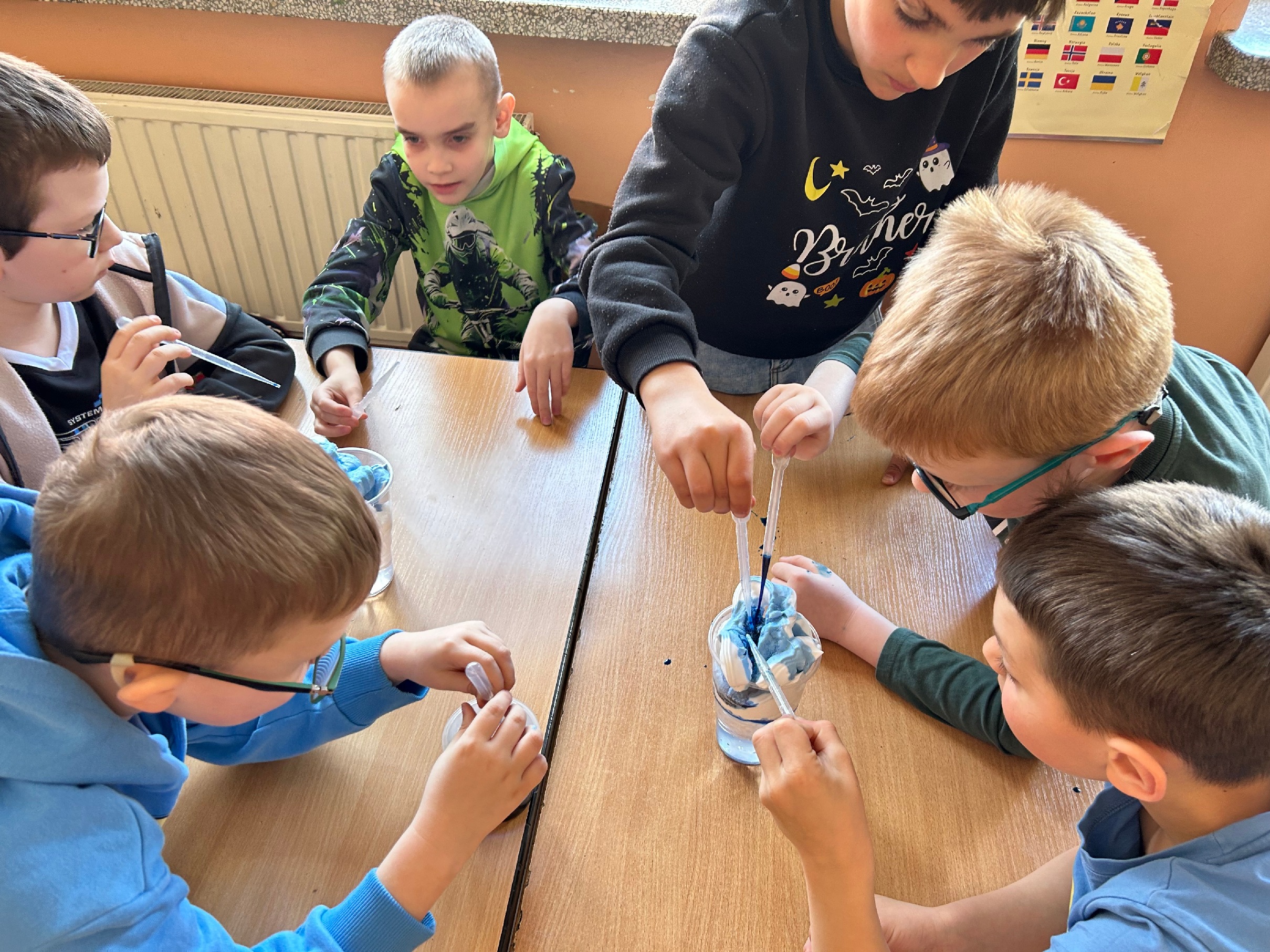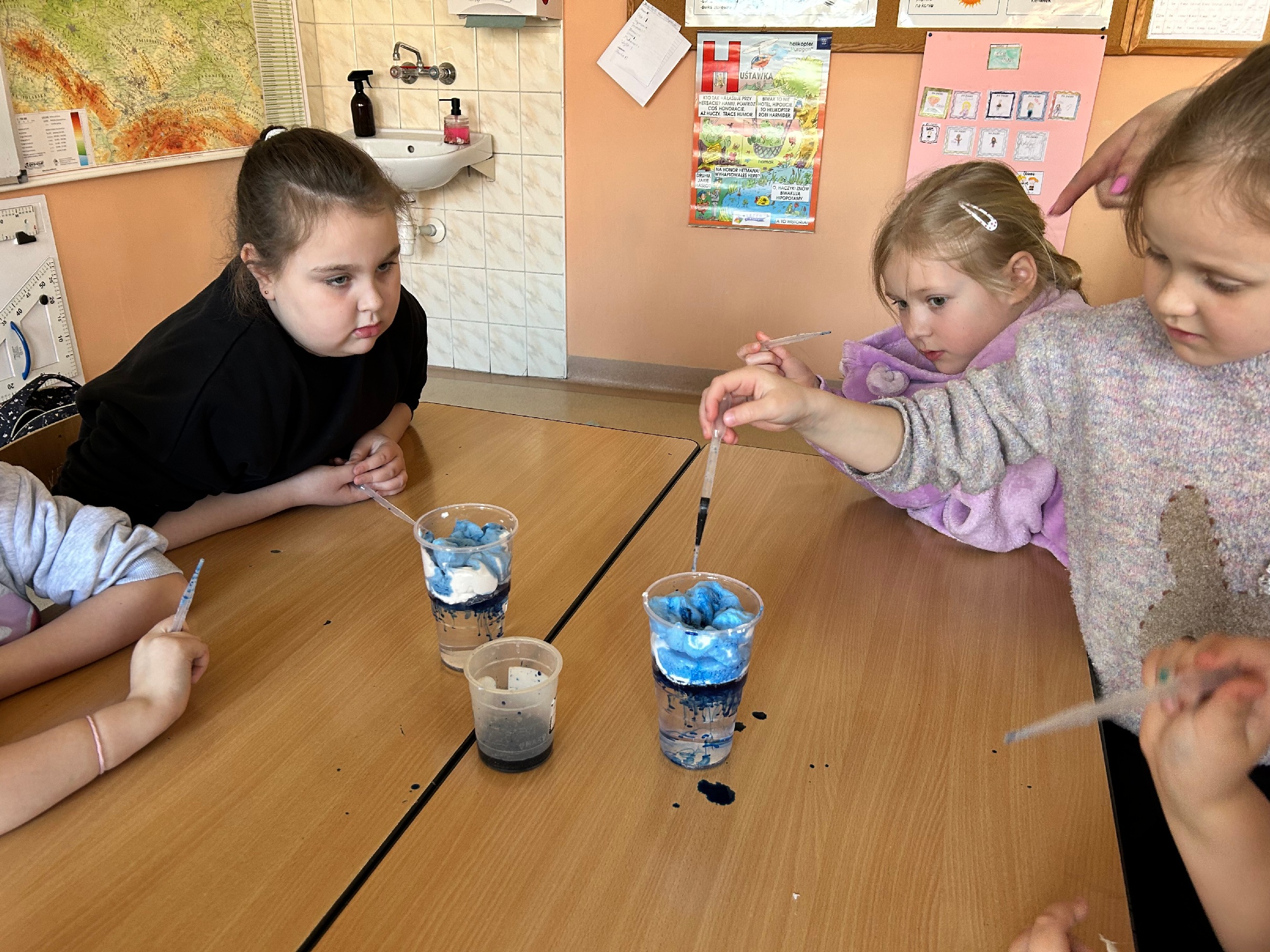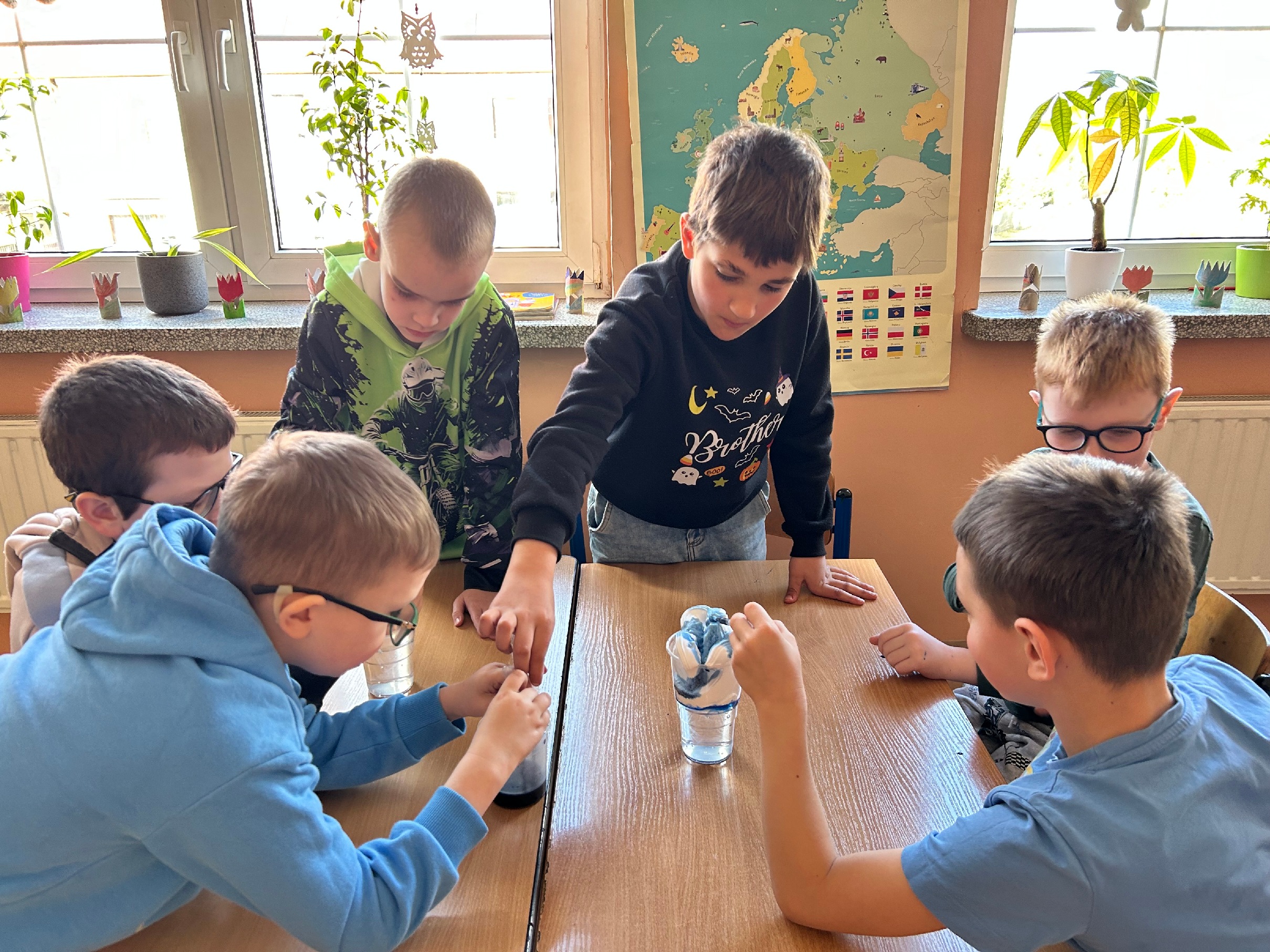 Podczas zajęć nie zabrakło również części praktycznej. Wspólnie wykonaliśmy doświadczenie „deszcz w słoiku”, które w ciekawy sposób pozwoliło zrozumieć zjawiska zachodzące w przyrodzie, takie jak powstawanie chmur i opadów. Eksperyment wzbudził duże zainteresowanie i zaangażowanie uczniów, którzy z entuzjazmem obserwowali jego przebieg. /AK, WG, JS/
