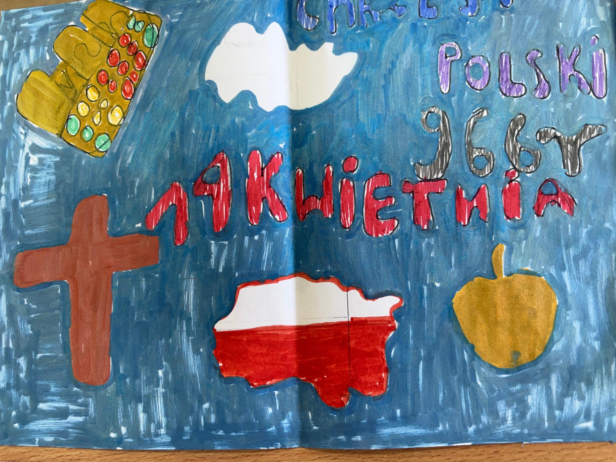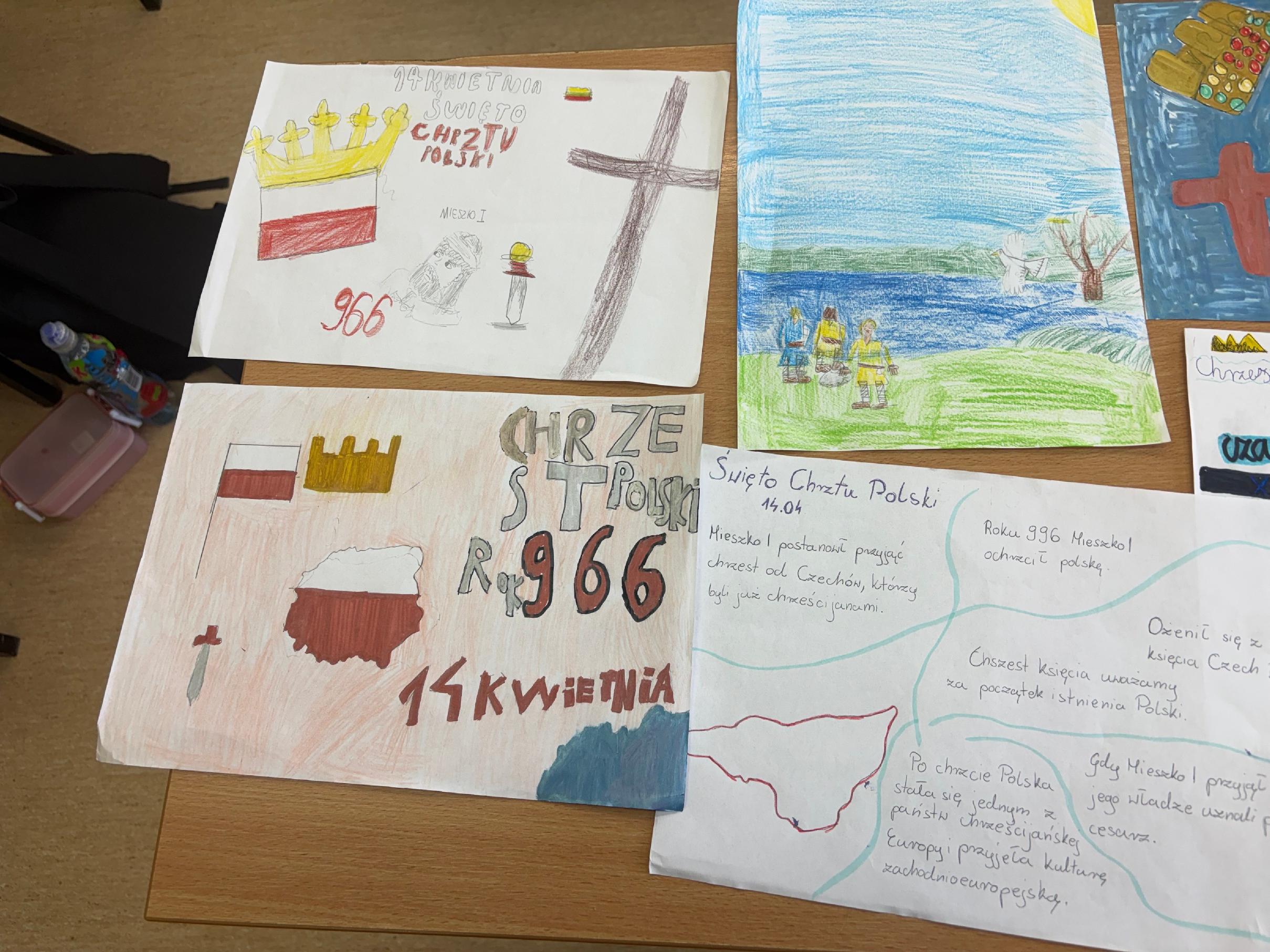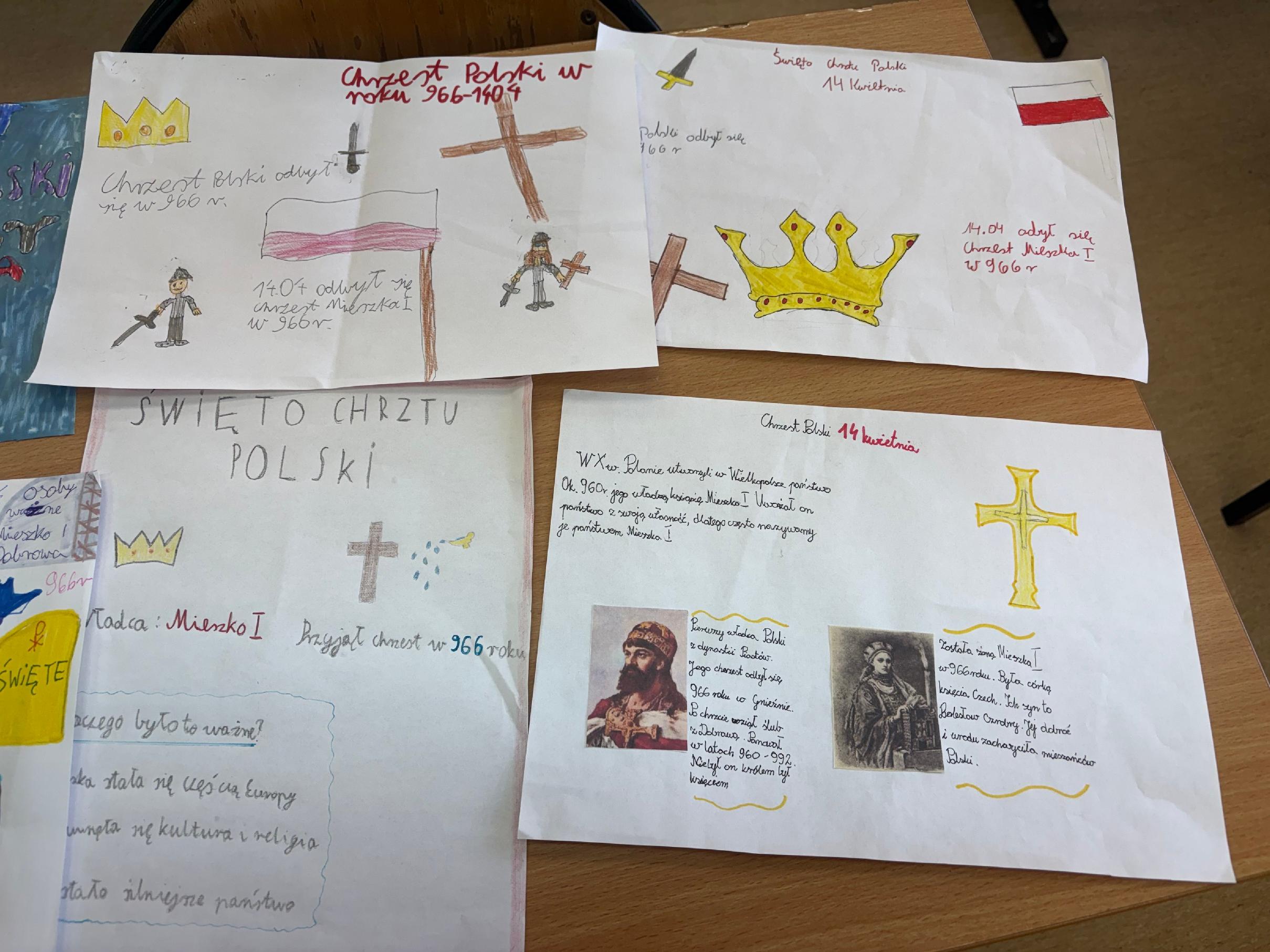 Uczniowie klasy 4 aktywnie uczestniczyli w obchodach podczas kilku lekcji historii. W ramach zajęć przygotowywali plakaty przedstawiające wydarzenia związane z początkami państwa polskiego oraz postaci pierwszych Piastów.
