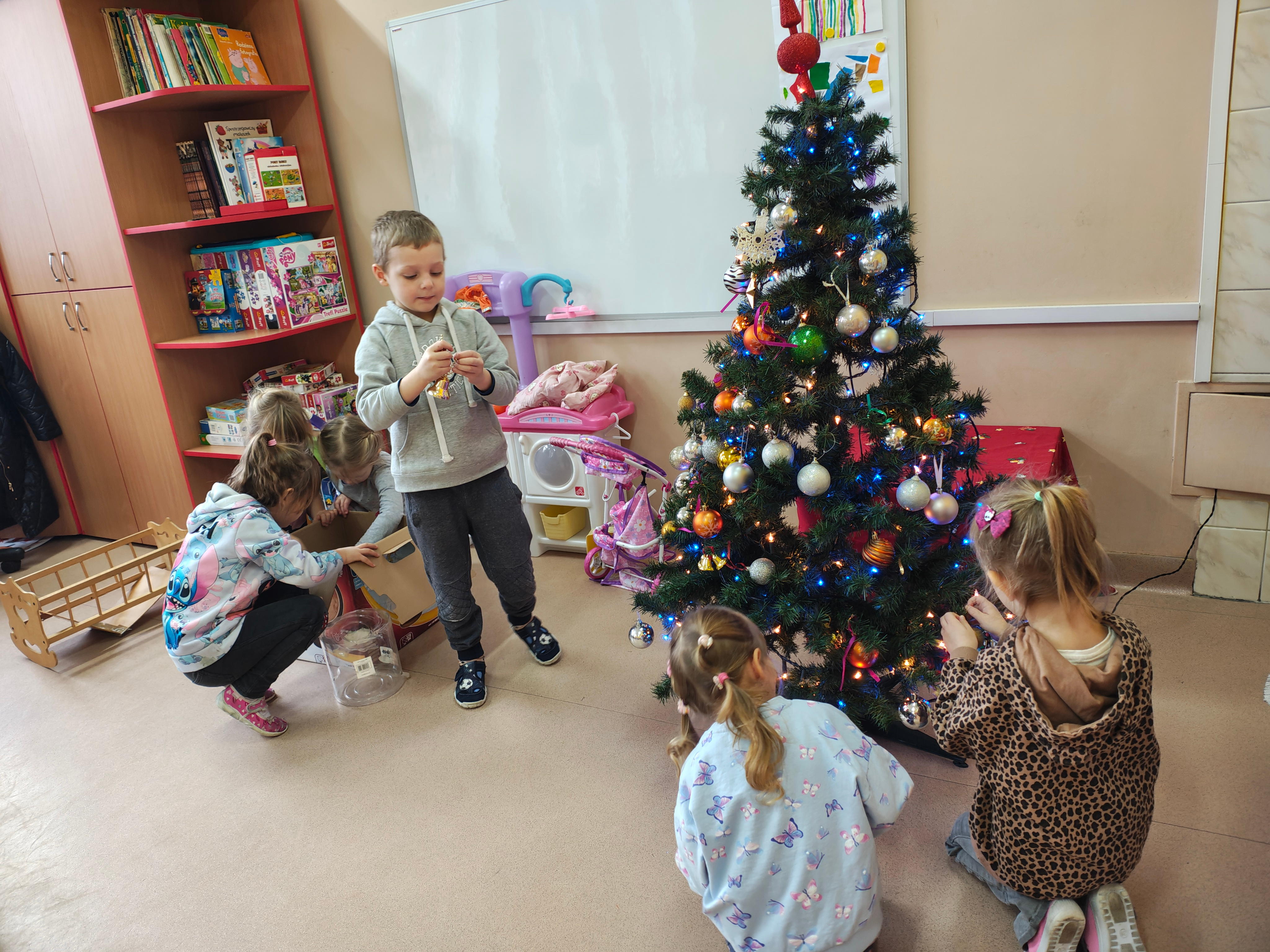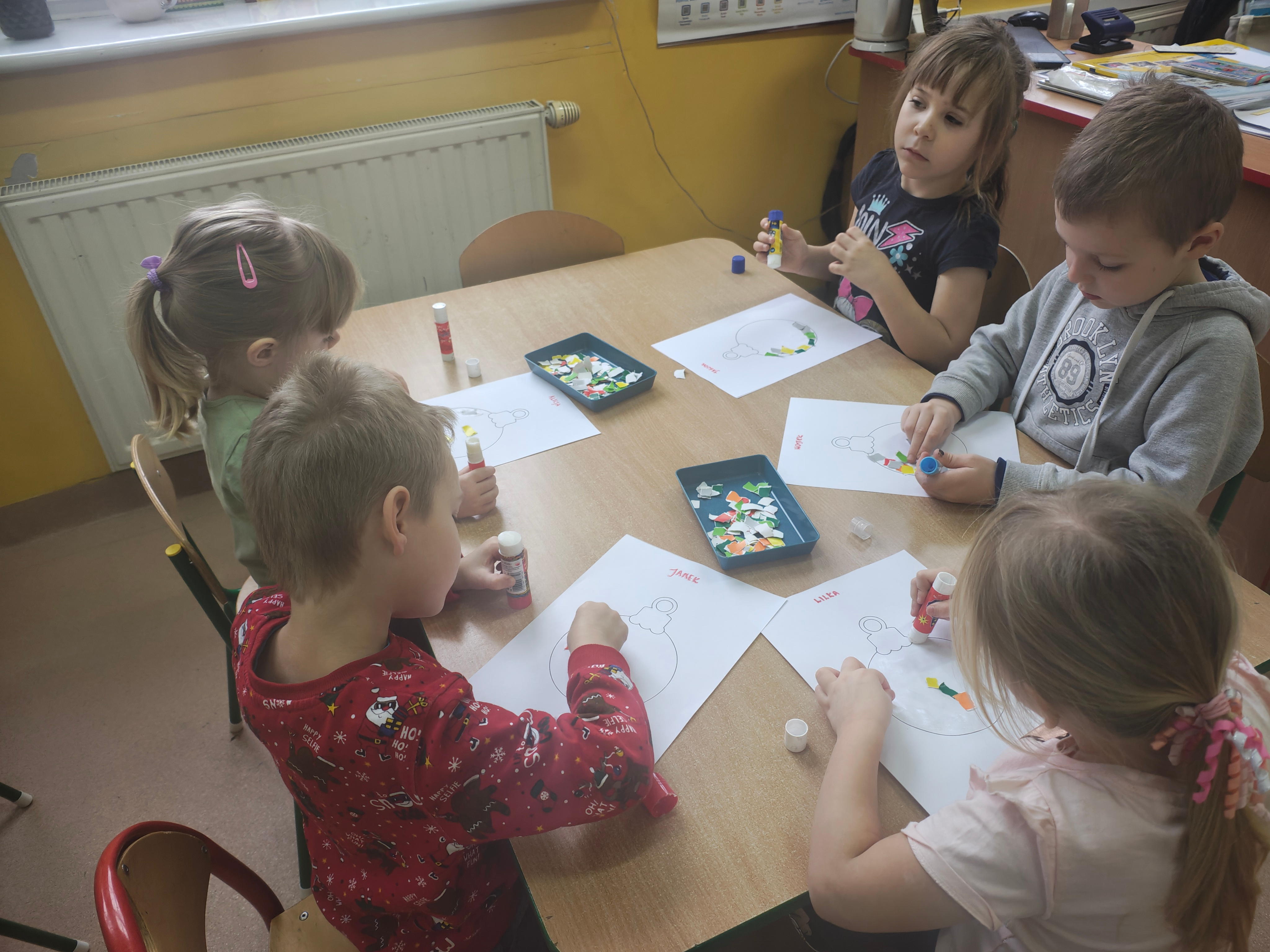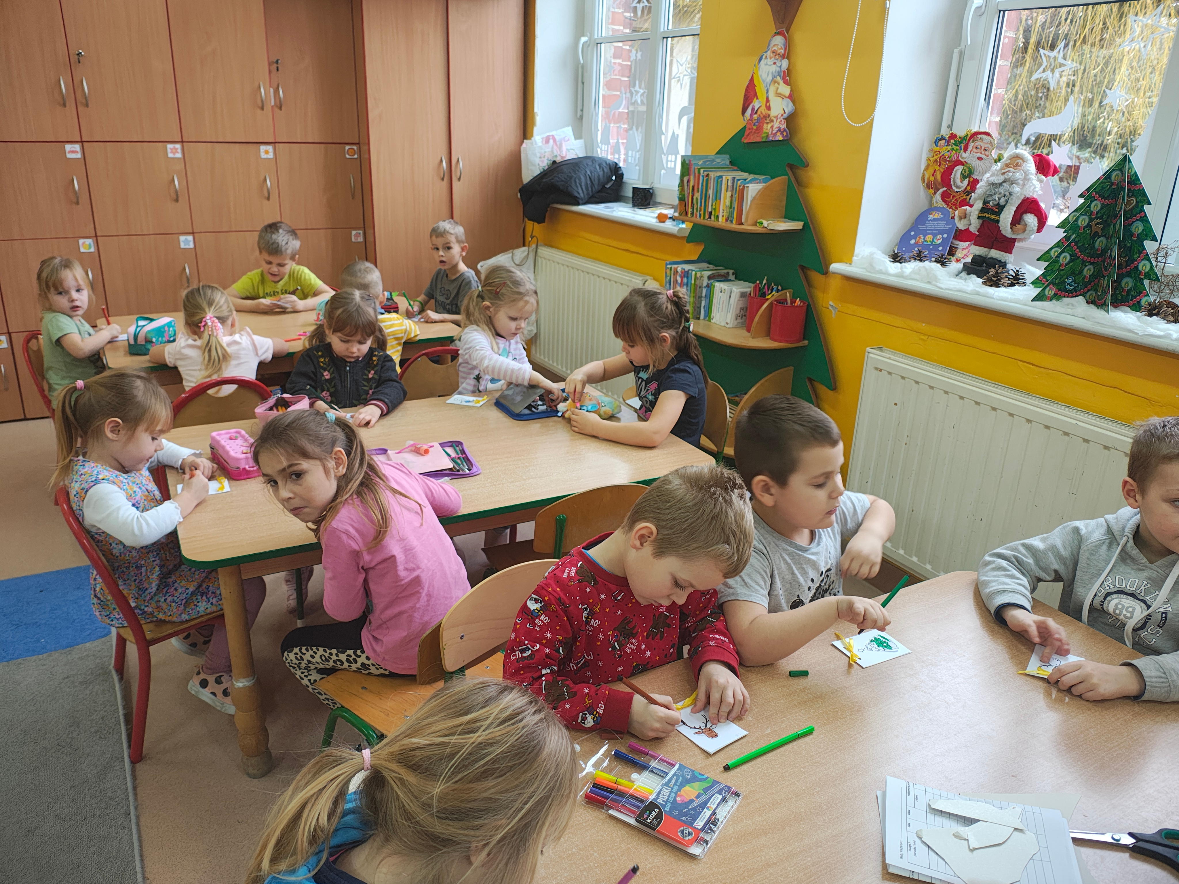 Przedszkolaki z wielkim zaangażowaniem przygotowują się do świąt Bożego Narodzenia. W oddziale przedszkolnym wykonują różnorodne zadania związane z tematyką świąteczną. Uczestniczą w zajęciach plastycznych, podczas których tworzą ozdoby i dekoracje, uczą się kolęd, poznają świąteczne tradycje oraz biorą udział we wspólnych zabawach i zadaniach.