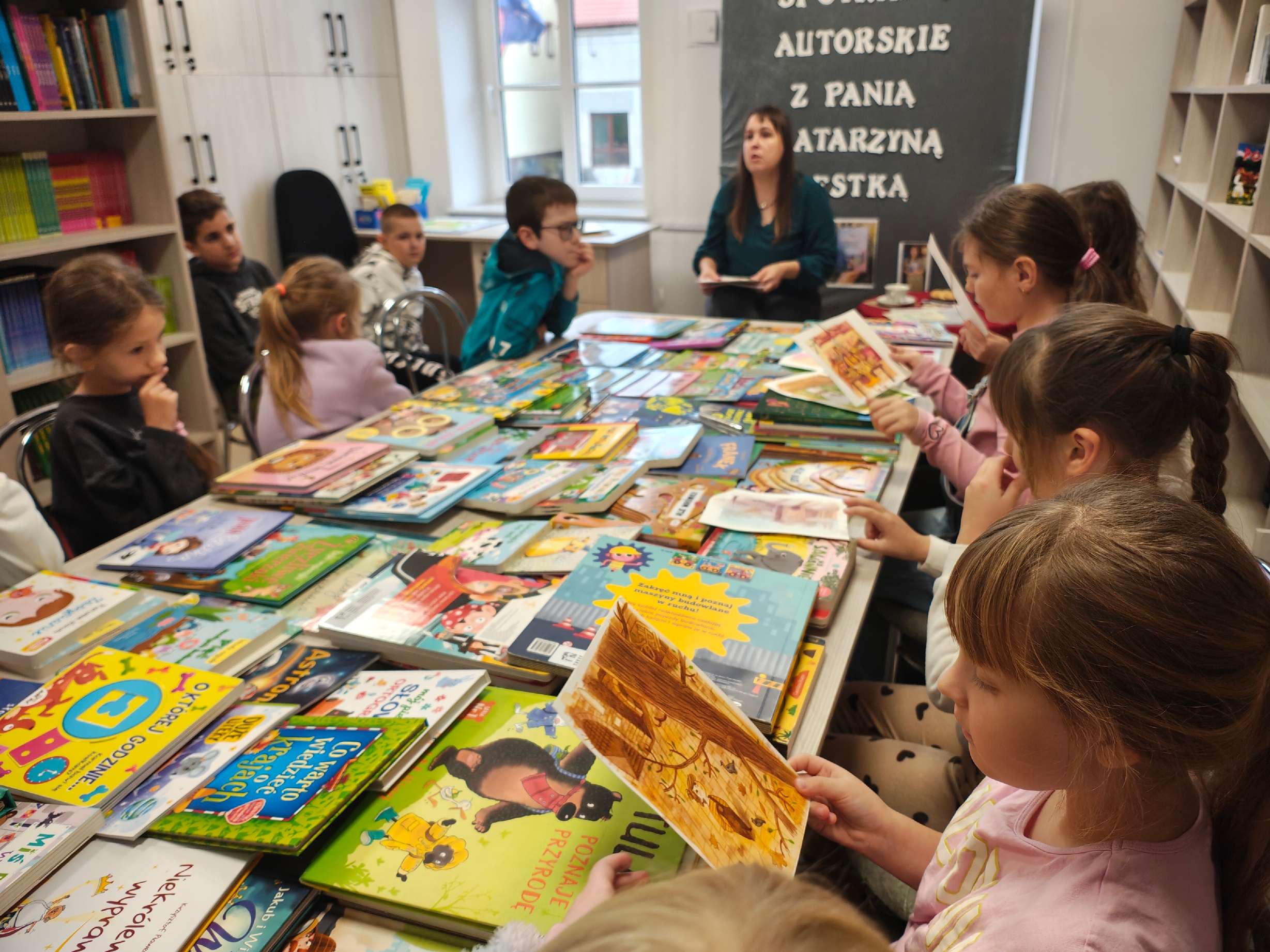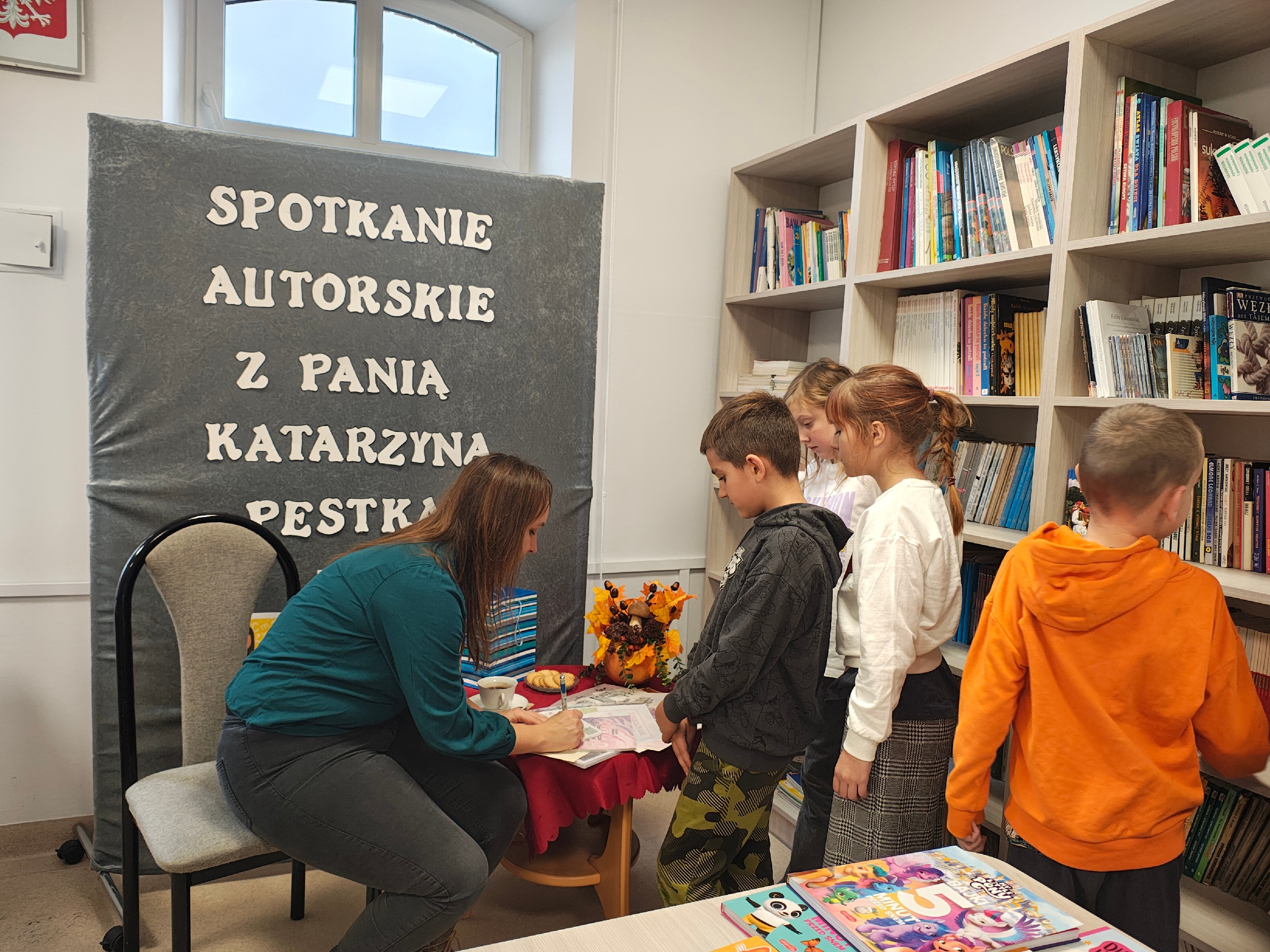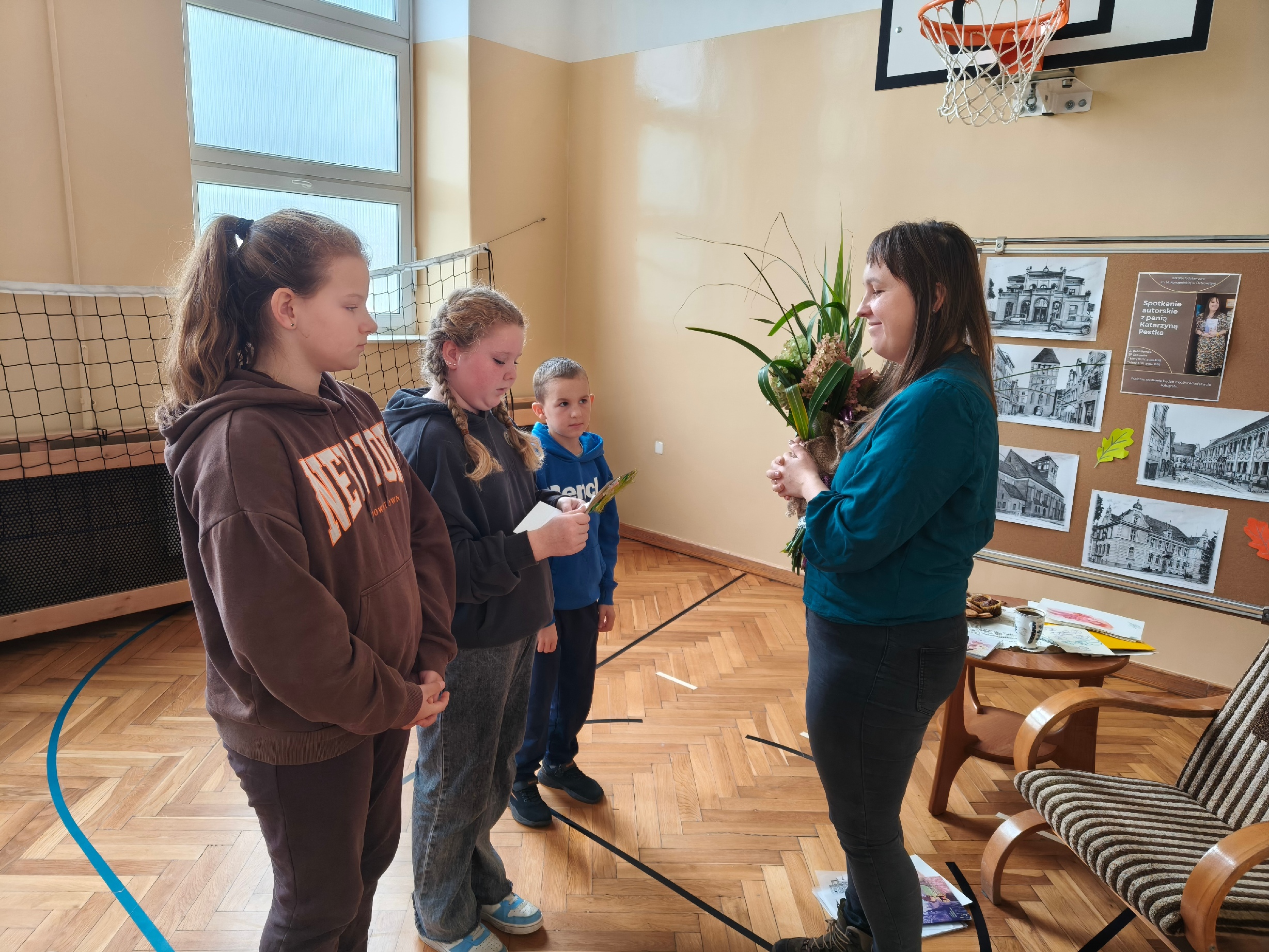 27 października odbyło się spotkanie autorskie z panią Katarzyną Pestką, autorką książki dla dzieci „Tajemnicze zaginięcie Matki Natury”. Akcja tej niezwykłej opowieści rozgrywa się w Chojnicach i Borach Tucholskich. W spotkaniu uczestniczyli uczniowie klas II, III, IV i V. Pisarka w ciekawy i przystępny sposób opowiedziała o etapach powstawania książki, zdradziła wiele interesujących ciekawostek z pracy pisarza oraz opowiedziała, z jakimi trudnościami spotyka się autor podczas tworzenia. Na zakończenie uczniowie wręczyli pisarce podziękowania oraz wspaniały bukiet jesiennych, ogrodowych kwiatów. Spotkanie bardzo się wszystkim podobało i dostarczyło wielu inspiracji. Z niecierpliwością czekamy na kolejne książki pani Katarzyny Pestki, szczególnie na zapowiadany przewodnik rowerowy, w którym autorka opisze trasę rowerową po Kosznajderii. Serdecznie dziękujemy Radzie Rodziców za sfinansowanie spotkania, a tym samym nieustanne wspieranie naszych działań edukacyjnych i kulturalnych. /LKS,KR/