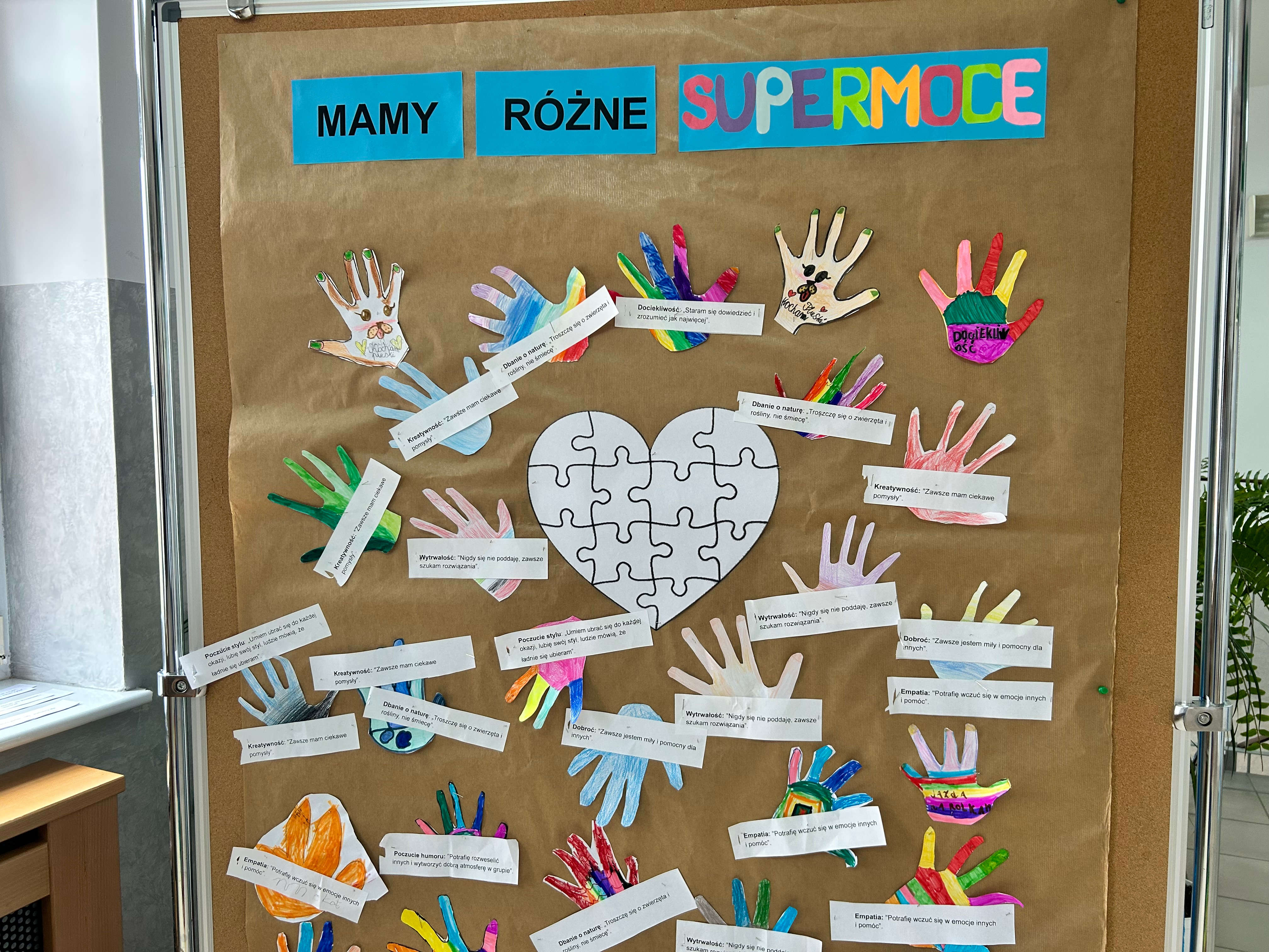 Podczas zajęć uczniowie mieli okazję porozmawiać o tym, czym jest autyzm, jak postrzegają świat osoby w spektrum oraz jak możemy okazywać im wsparcie i zrozumienie na co dzień. Szczególnym elementem wydarzenia była aktywność plastyczna – uczniowie odrysowywali swoje dłonie, a następnie wpisywali w nich swoje „supermoce" lub wybierali cechy, które ich wyróżniają.