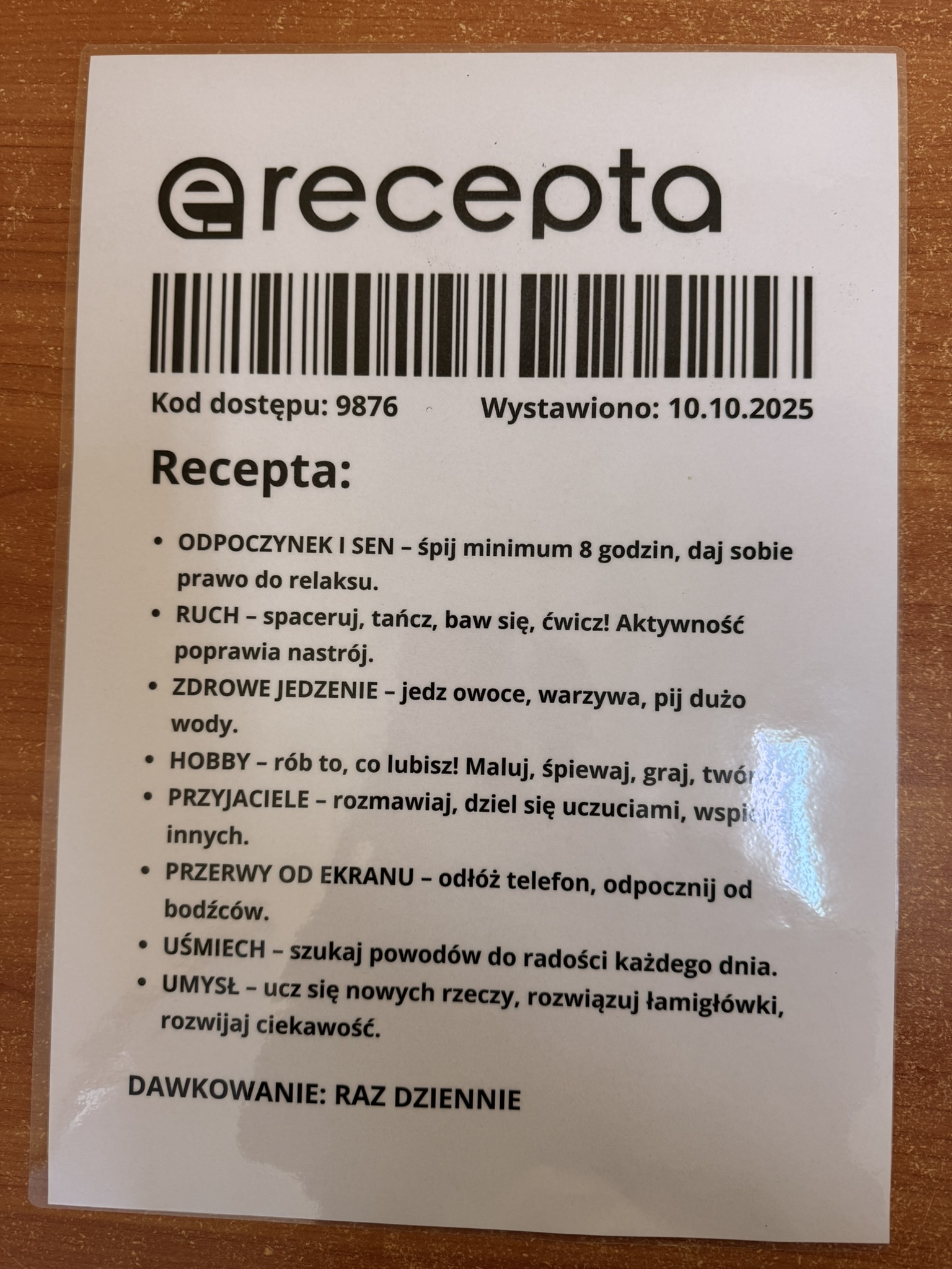 Panie psycholog i pedagog wcieliły się w rolę „pielęgniarek zdrowia psychicznego” ?⚕️? i wręczyły uczniom recepty na dobre samopoczucie – z zaleceniami pełnymi życzliwości, wdzięczności, odpoczynku i pozytywnego myślenia.