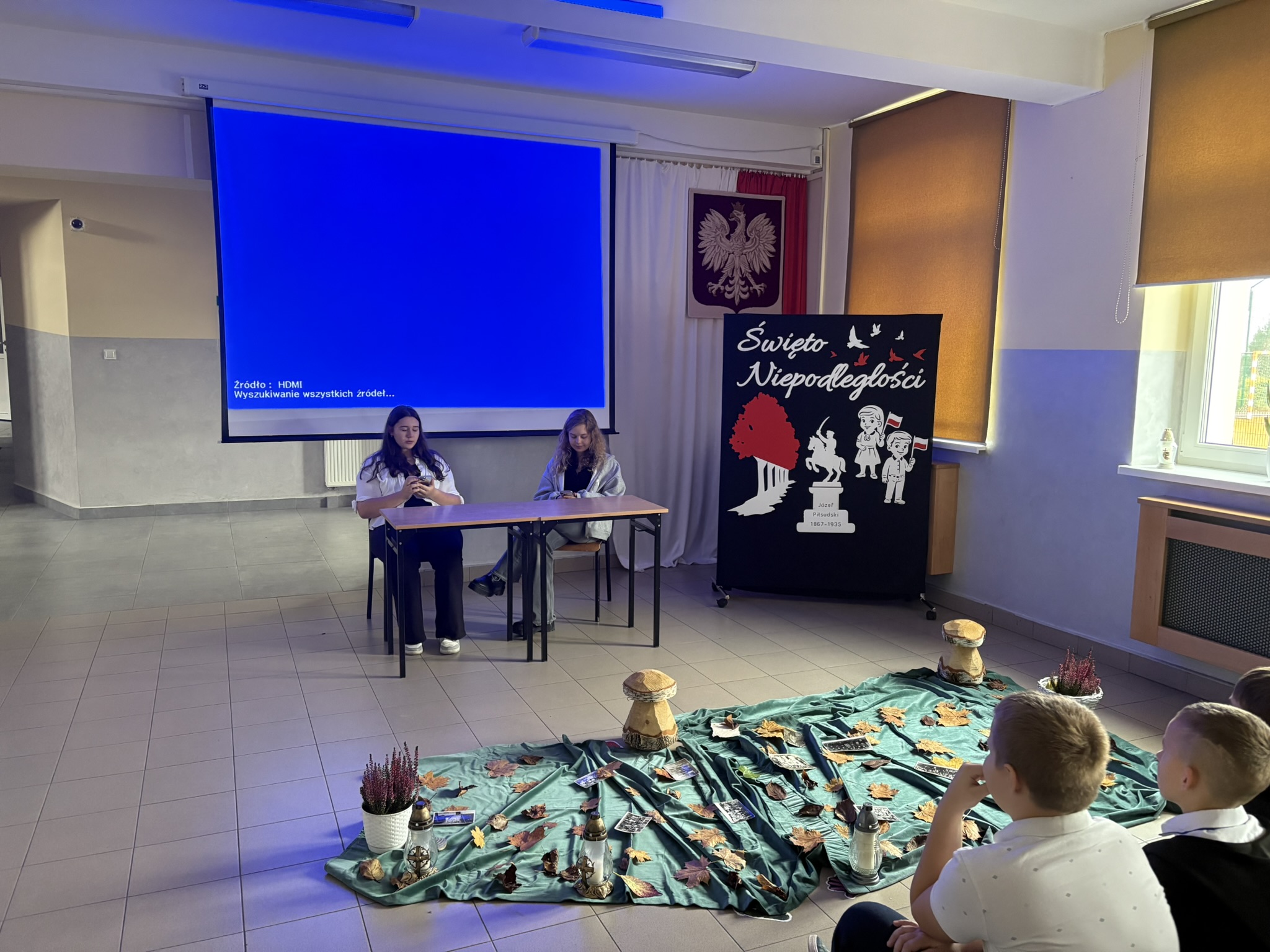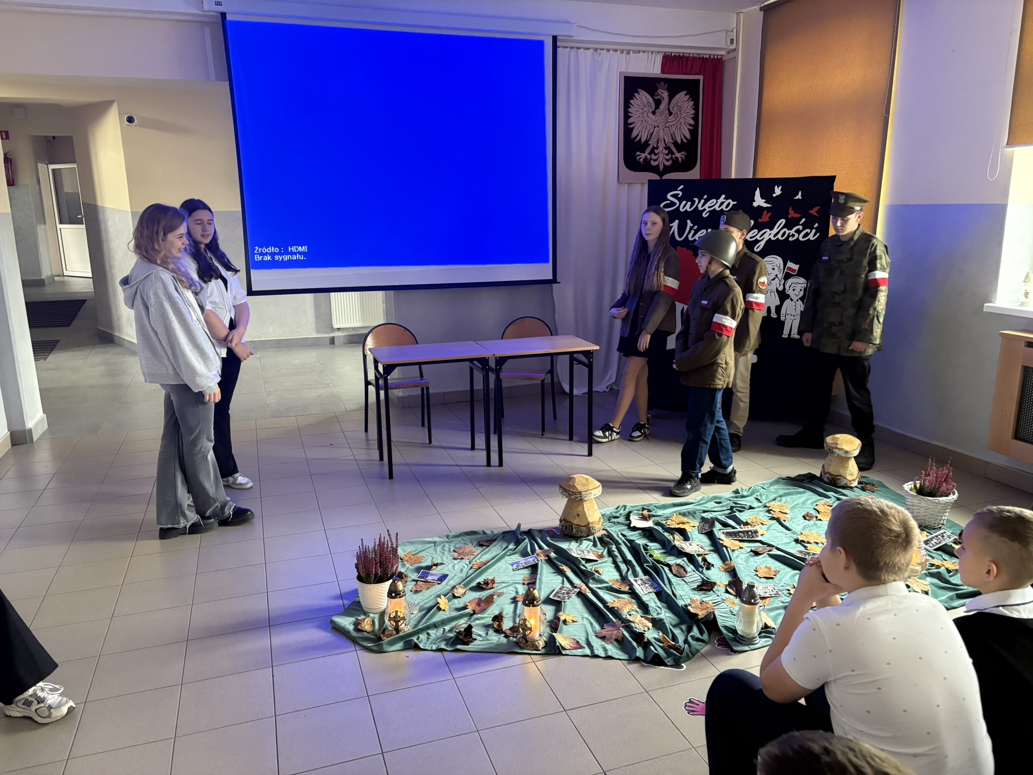 Z okazji Narodowego Święta Niepodległości uczniowie klasy VII przygotowali apel pt. „Spotkanie z przeszłością”. Podczas uroczystości przenieśliśmy się w czasy zaborów, by przypomnieć sobie trudną drogę Polaków do wolności. Wirtualnie poznaliśmy Józefa Piłsudskiego, zajrzeliśmy do dawnych Chojnic oraz spotkaliśmy się z małymi bohaterami naszej ojczyzny – Orlętami Lwowskimi, sanitariuszką z bitwy pod Warszawą, harcerzami z Szarych Szeregów i uczestnikami powstania warszawskiego.